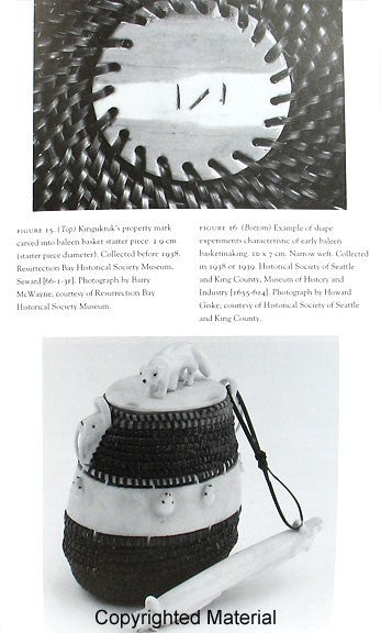Baleen is a malleable and durable material that once had commercial uses equivalent to those of plastics today. Baskets made of baleen, the fibrous substance found in the mouths of plankton-eating whales, were first created by Alaska Natives in the early years of the twentieth century. Because they were made for the tourist trade, they were initially disdained by scholars and collectors, but today they have joined other art forms as a highly prized symbol of native identity. Baskets of exquisite workmanship, often topped with fanciful ivory carvings, have been created for almost a century, contributing significantly to the livelihood of their makers in the Arctic villages of Barrow, Point Hope, Wainwright, and Point Lay, Alaska.