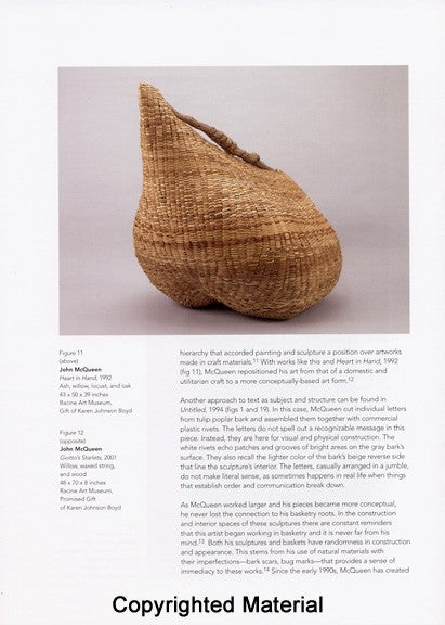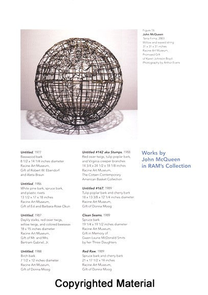 In this twenty page booklet Racine Art Museum Executive Director Bruce Pepich describes John McQueen as "one of the leading artists working in fibers today" and as a "pivotal figure in contemporary basketry".