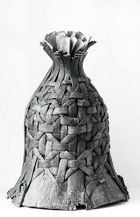 "My intent is to construct a vessel or related object using materials respectfully harvested from nature. The unique properties I find in bark, branches, roots, seaweed and stone suggest a work process to me. I want this problem solving to be evident in the finished piece. Some of these structures are basket like." Artist statement, Dorothy Gill Barnes.