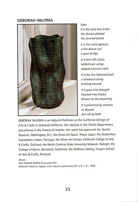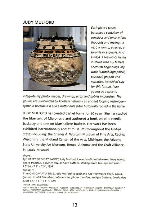 Find inspiration in these three California artists who take very different approaches to their art. Marion Hildebrandt gathers native flora and fauna for her baskets, Judy Mulford surrounds gourds with knotless netting and integrates photographic images, drawings, words, polymer figures and found objects. Deborah Valoma creates vessels of woven copper and of waxed linen and wire.
