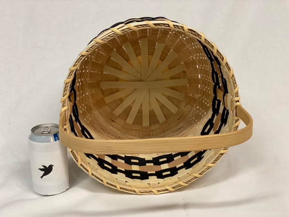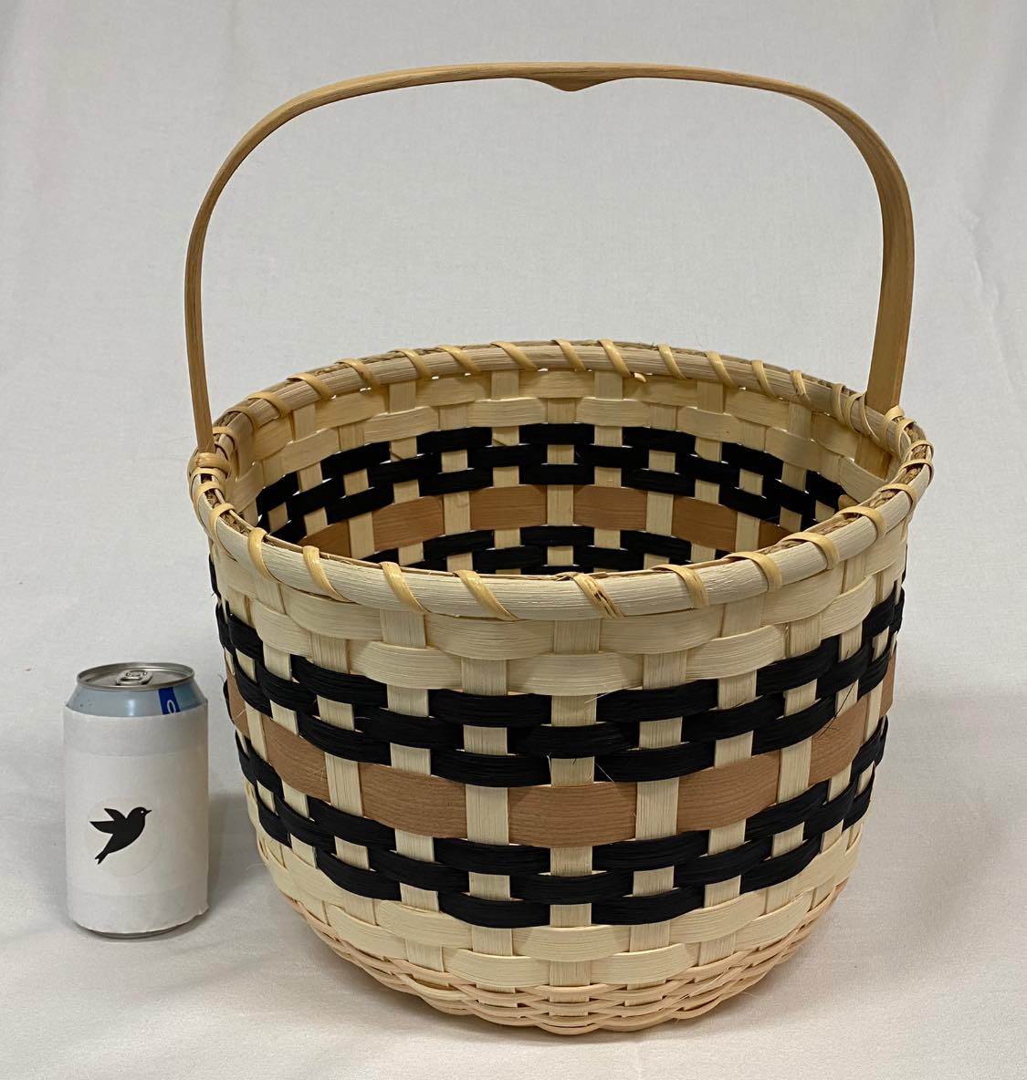 This is one of the baskets my Granny designed. She used it to gather apples. With a woven base 10" in diameter this basket stands 13" tall including the 12" wooden handle.