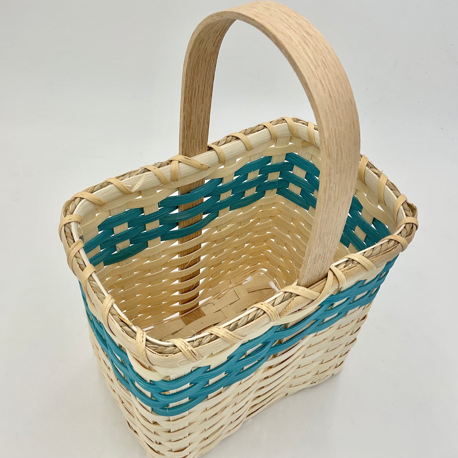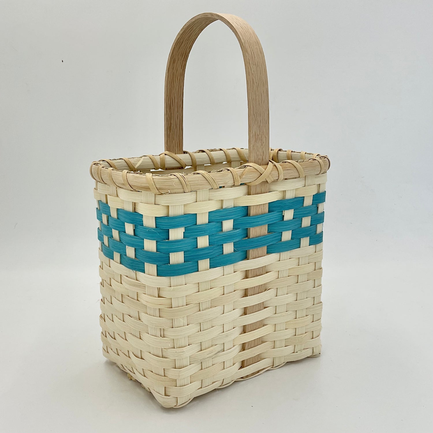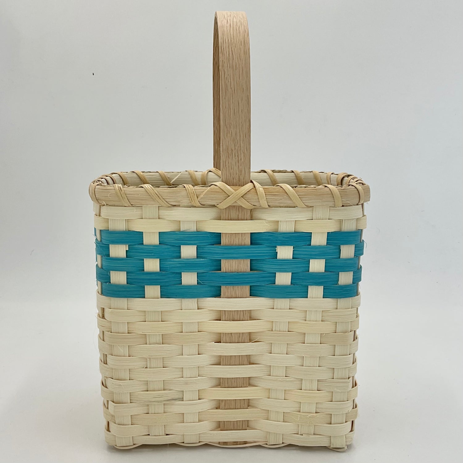 Double Wine Basket features a woven bottom with a wooden handle woven into the basket. Basket including a letter/wooden panel is $60.00. $55.00 without letter. Many colors and styles are available.