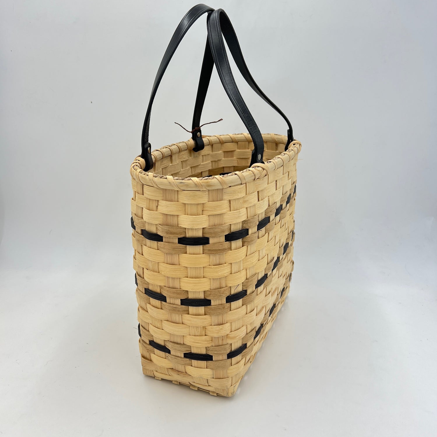You’ll enjoy creating this generously-sized easy-to-make basket with natural reed, dyed reed, and paper splint. The set of leather handles add a great look, and they are so practical! Perfect for shopping or carrying projects, this filled-base basket measures 13" x 5 1/2" at the base and stands 13" tall.