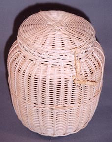 Based on a charming Victorian purse, this small lidded basket is made with #3 spokes and #2 weavers. Looped insertions are added to enhance the shape, then finished off with a trac border on the underside. The lid is closely fitted and secured with a cane hinge and looped hasp. Basket size: base 3.25 inches, height 6.5 inches, widest diameter 5 inches. Author: Flo Hoppe