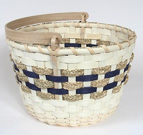 A fairly quick basket to make with wooden slotted base and pretty 12 inch oak swing handle. Size: 7" tall x 12" diameter at the rim.