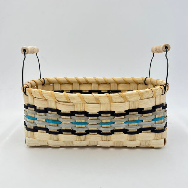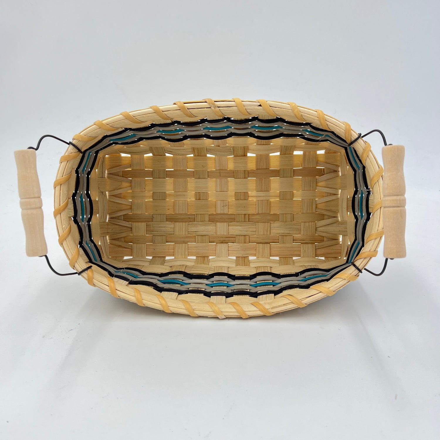 Imagine this basket filled with hot rolls sitting on your dinner table. Easy and fun to make, basket size is approximately 6" wide, 12" long and 5" tall with two wire handles at each end. The perfect basket for first-time basket makers.