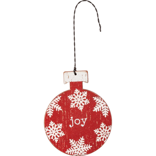 A rustic wooden Christmas ornaments featuring typeset "Joy" with snowflake designs. These embellishments are easily hung by twisted wire hooks.