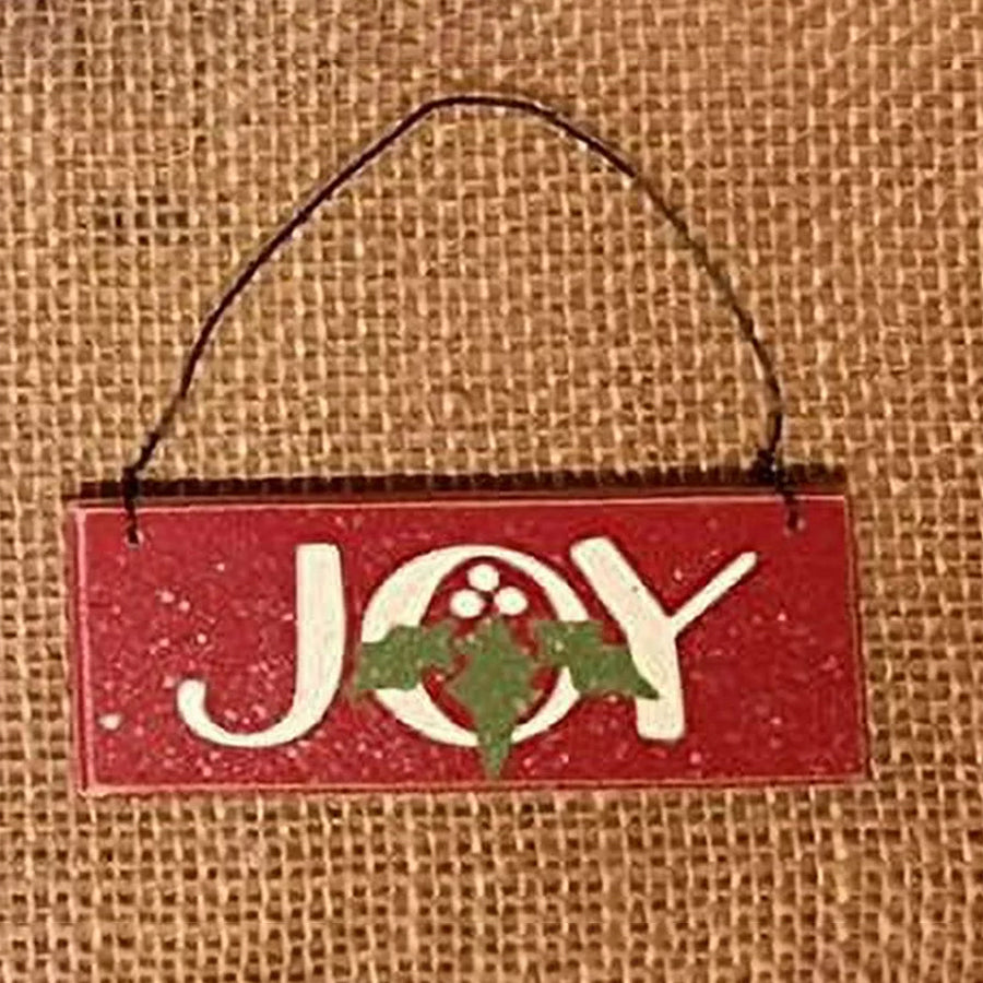 A rustic wooden embellishment featuring a hand-lettered sentiments: "Joy"