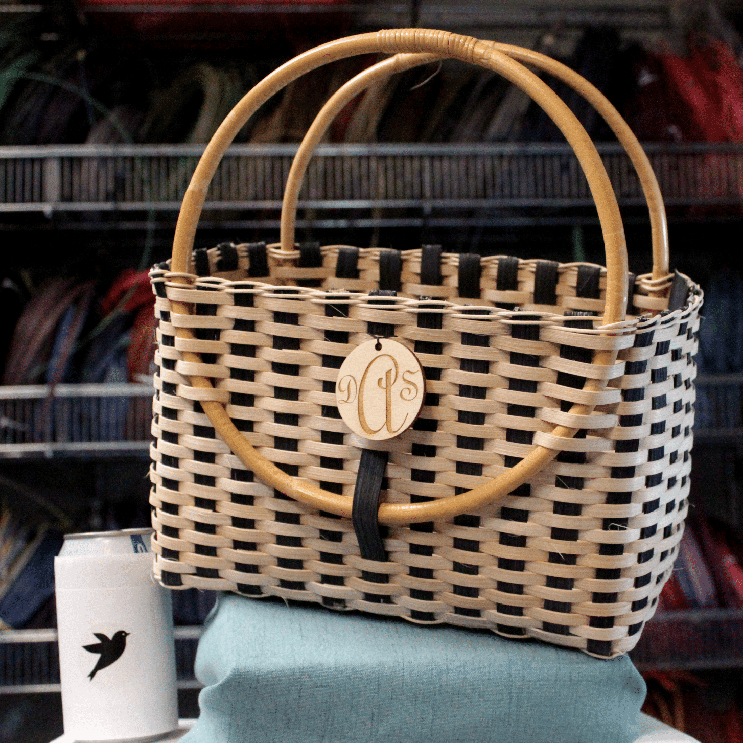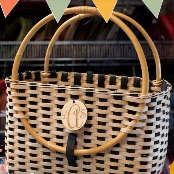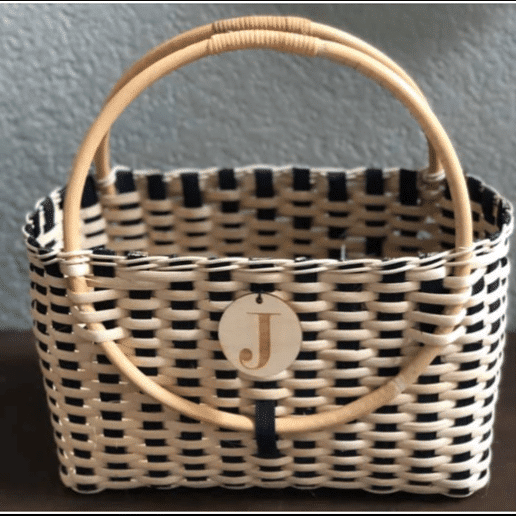 La Bourse is a charming purse that’s ready for an outing. She has all kinds of personality and style, and looks good no matter what she’s doing. This darling basket has a woven base, a set of sturdy handles, and an adorable 2” round wooden disk with your monogram engraved on it. She is 10” long by 5.5” wide with the woven part of the basket stands 7” tall, handles included it is 12” tall. Many colors options available.