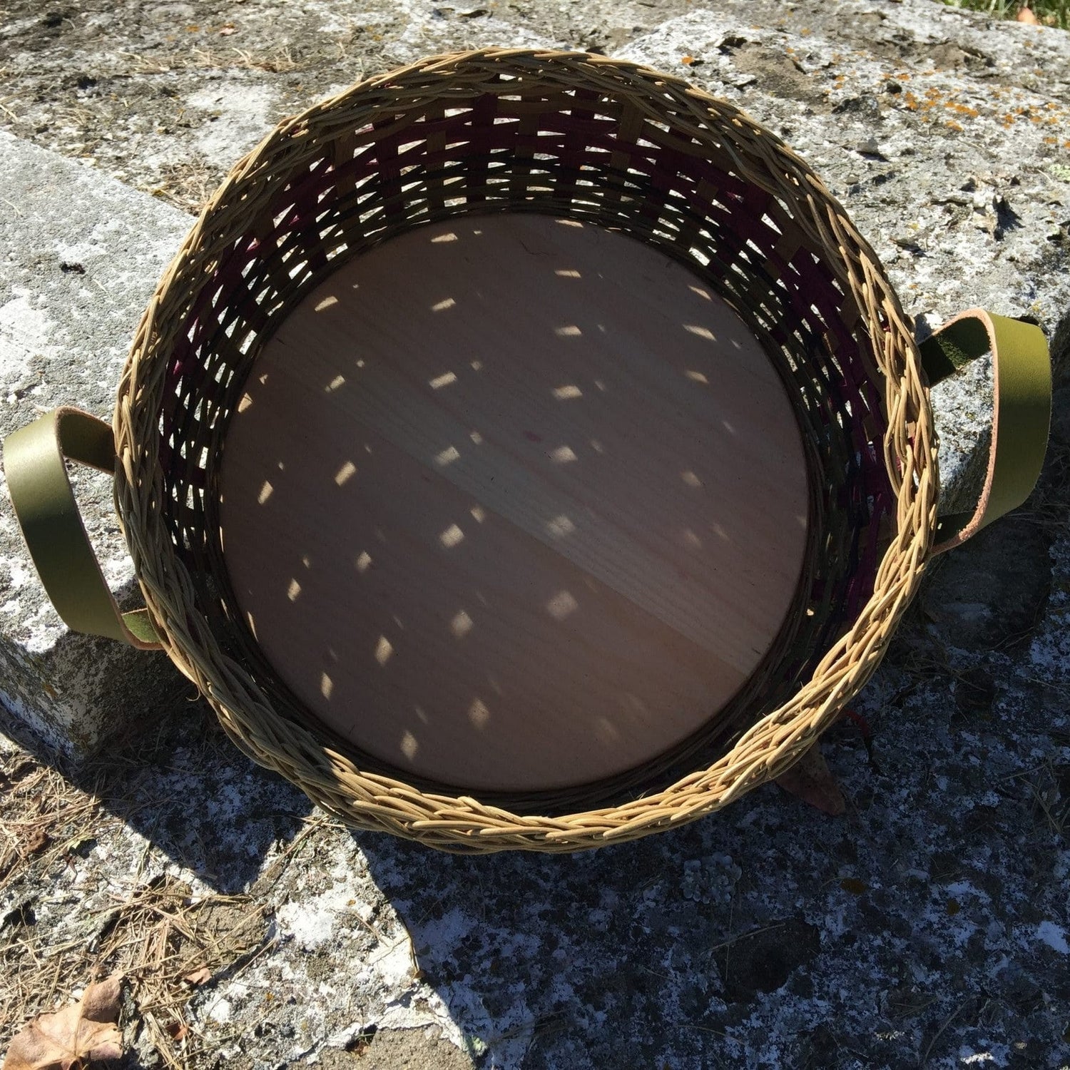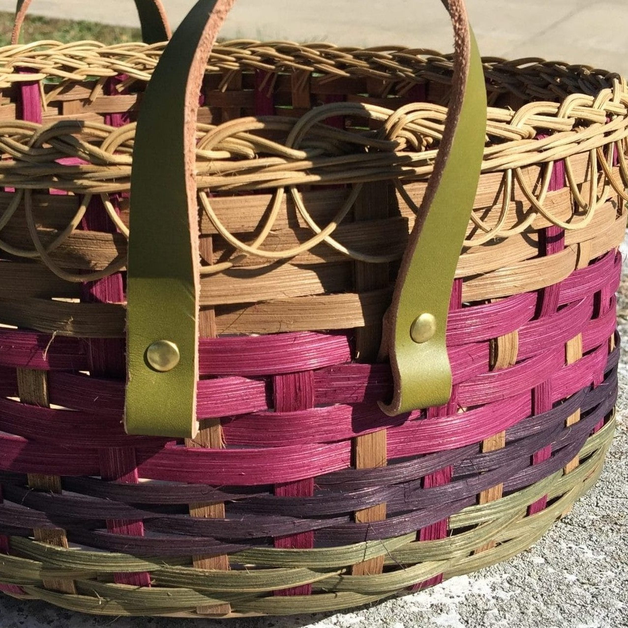 Leather–n–Lace has a 12” round wooden bottom with a set of leather handles. The weaving technic gives it an extra special look. This beauty has many different functions which will add unique character to any home.