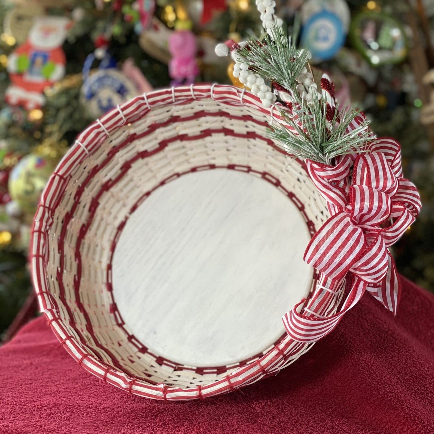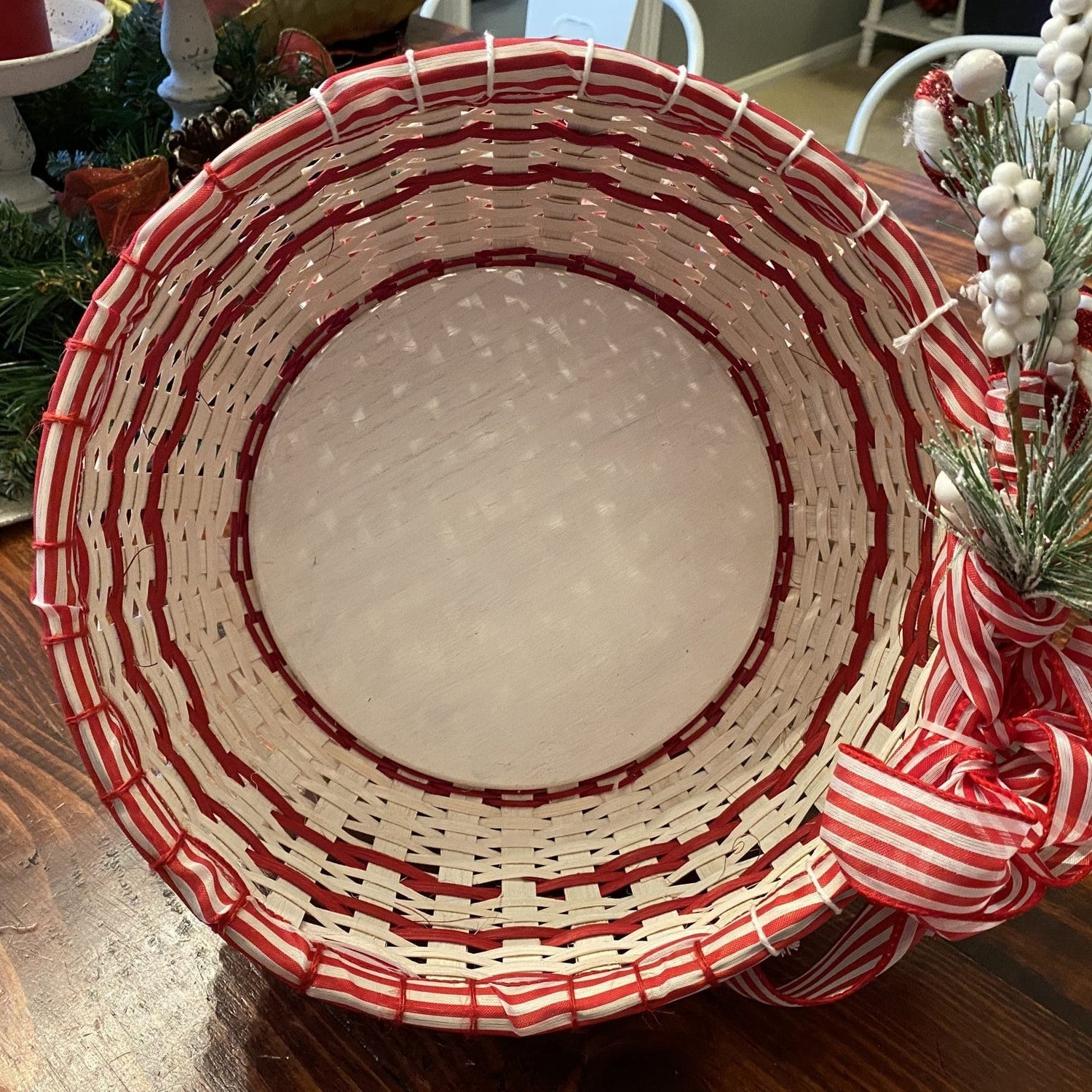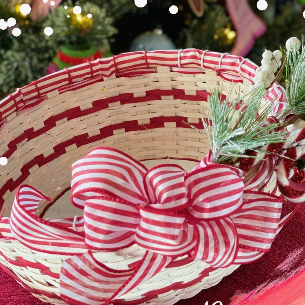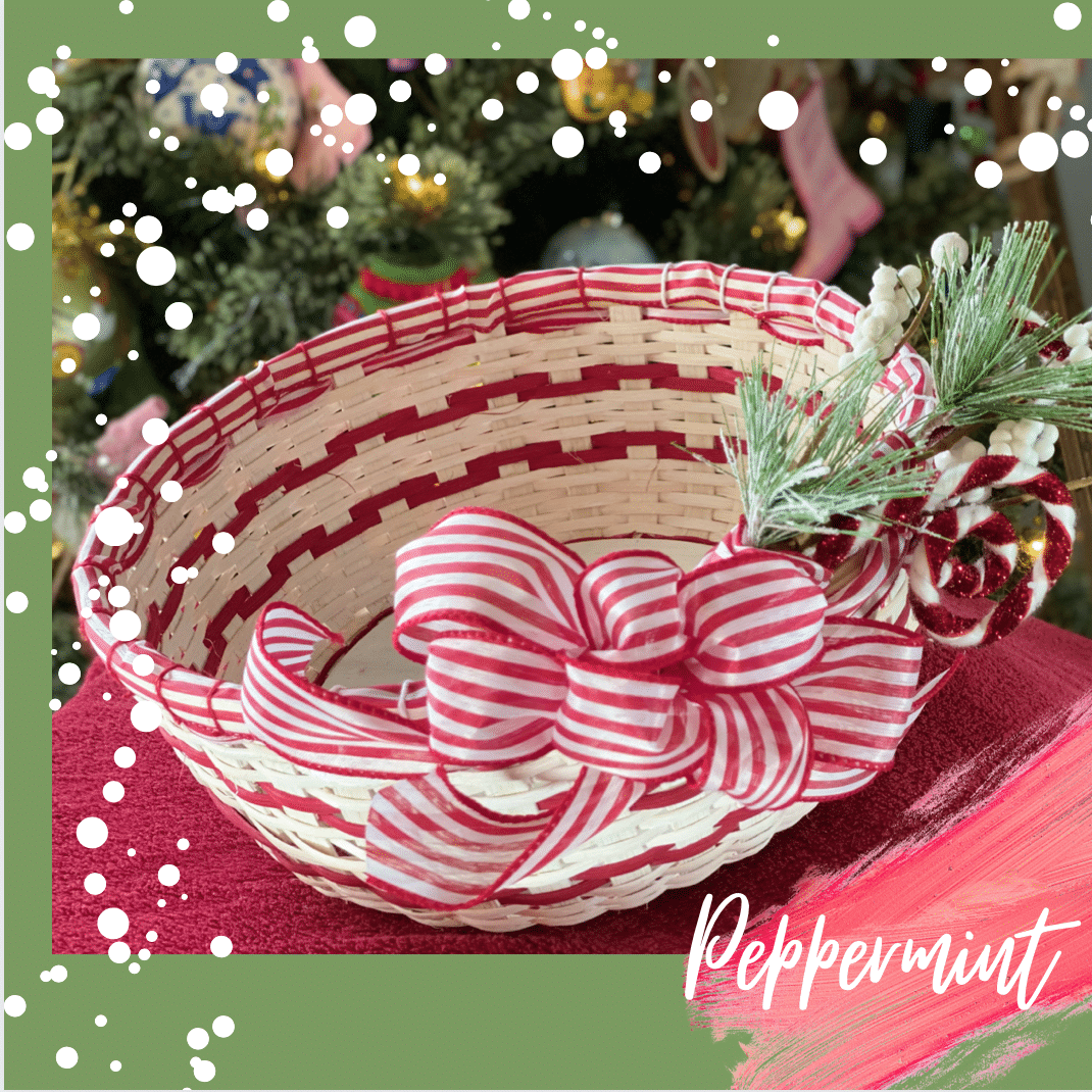 I wonder what smells and tastes come to mind when asked about your favorite holiday eats? I wonder what memories flood your mind when trying to decide what your favorite part of the season, or best family tradition is? One of my favorite things was my mom and I using peppermint bark for our holiday candies. This basket yells yummy and joy which I think we all hope for as family and friends gather together over the holidays. This basket adds a lot of cheer to any space with all it’s bells and whistles of whitewashed reed, 2 rows of peppermint ribbon and a holiday peppermint embellishment not to mention the puffy bow attached to the side. Come a weave a basket that celebrates both he old and new of the holiday season. Basket dimensions: 5” inches tall, 11” diameter, 36” circumference.