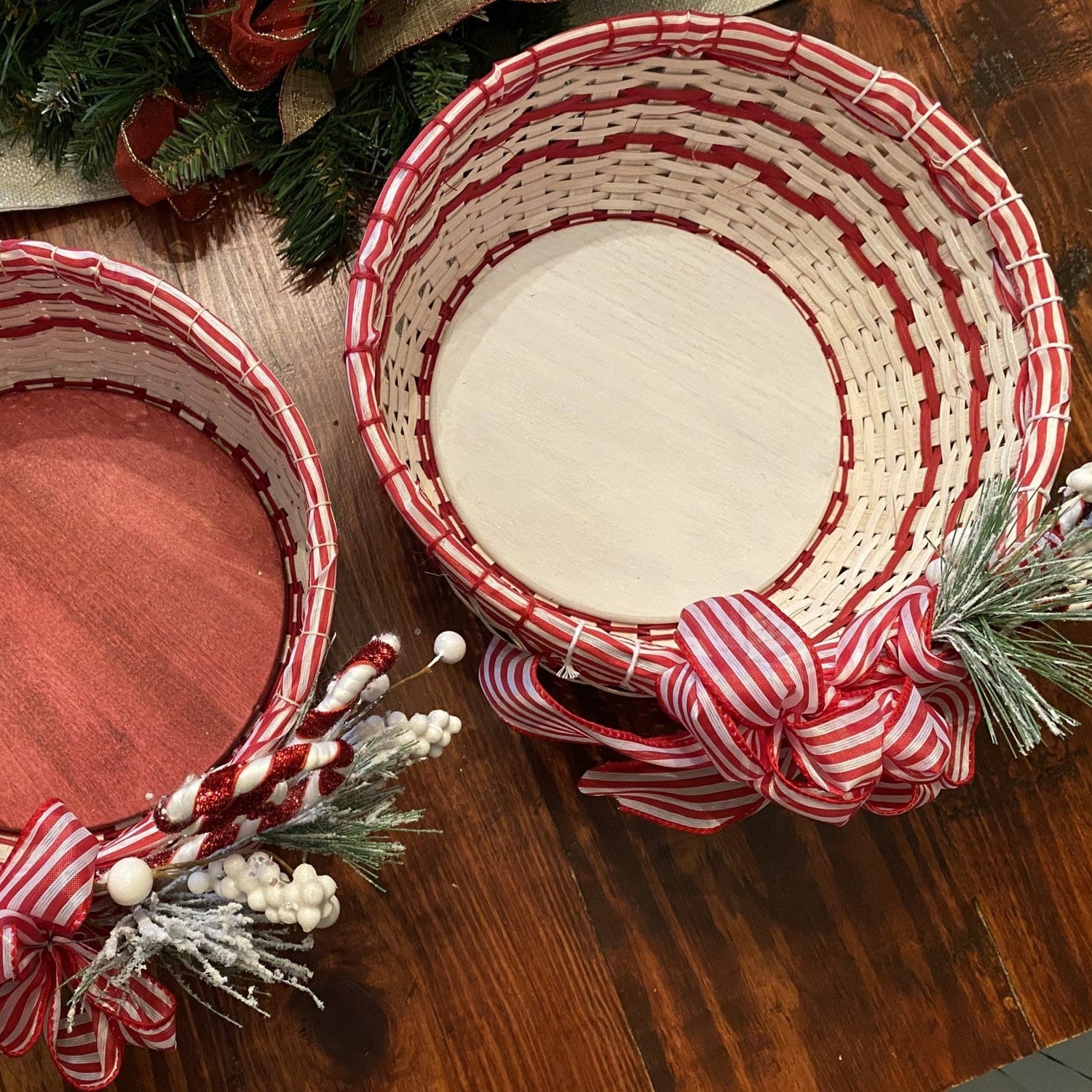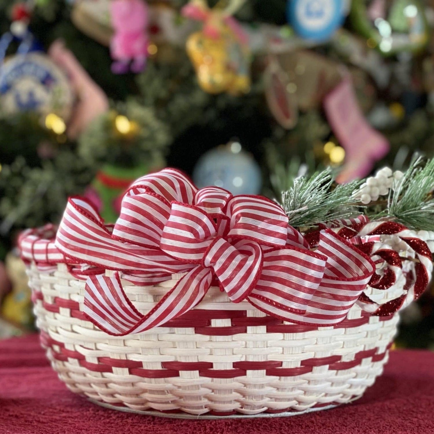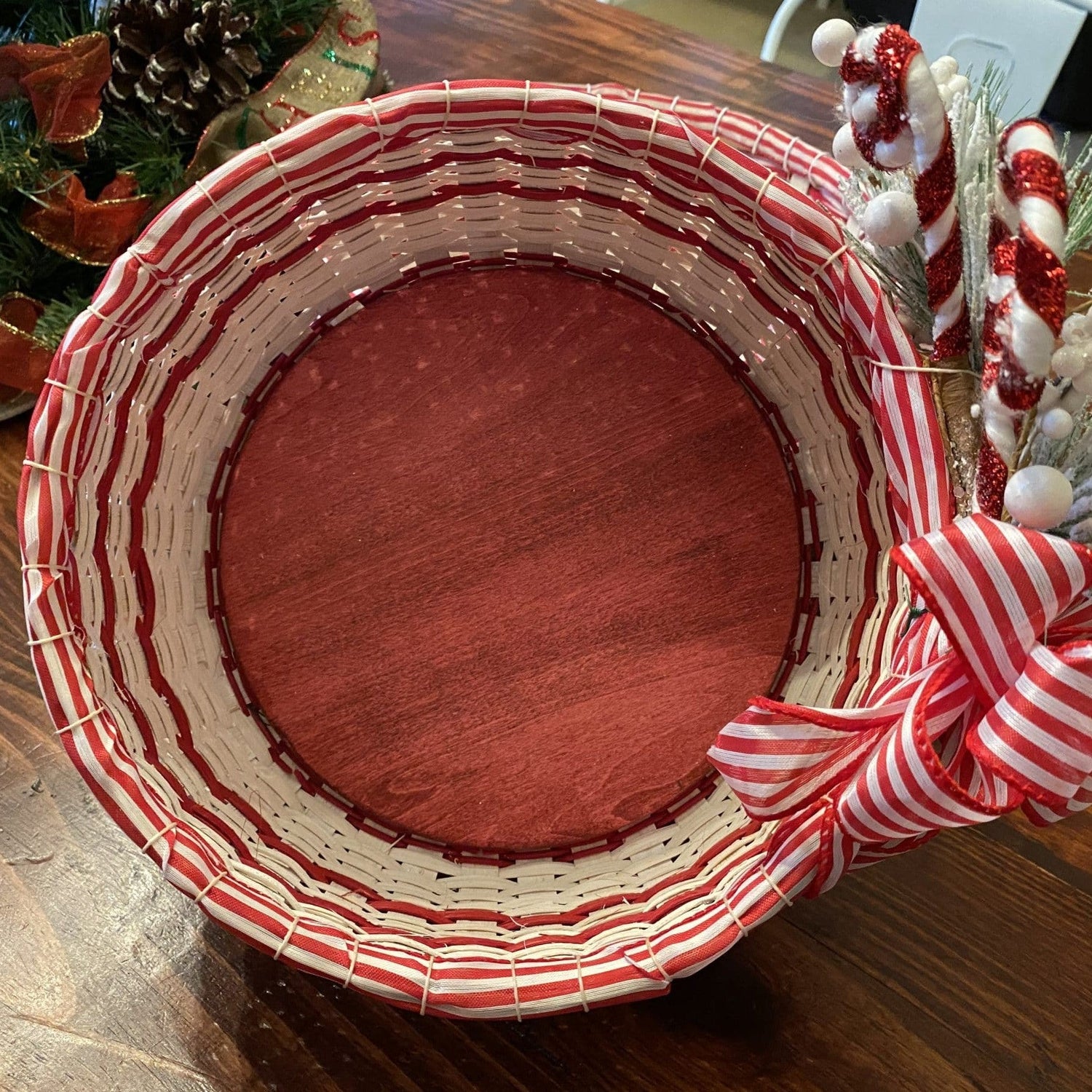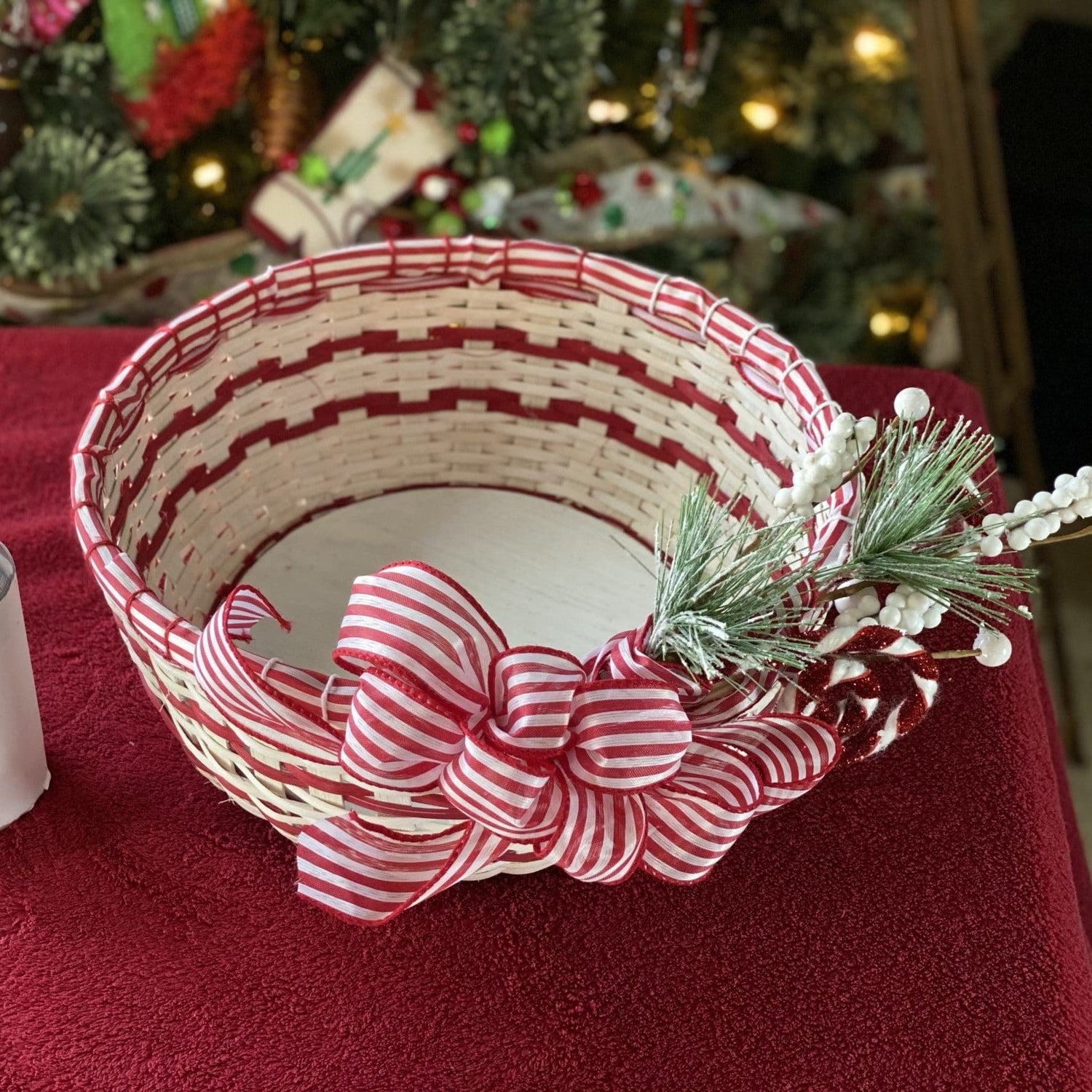 I wonder what smells and tastes come to mind when asked about your favorite holiday eats? I wonder what memories flood your mind when trying to decide what your favorite part of the season, or best family tradition is? One of my favorite things was my mom and I using peppermint bark for our holiday candies. This basket yells yummy and joy which I think we all hope for as family and friends gather together over the holidays. This basket adds a lot of cheer to any space with all it’s bells and whistles of whitewashed reed, 2 rows of peppermint ribbon and a holiday peppermint embellishment not to mention the puffy bow attached to the side. Come a weave a basket that celebrates both he old and new of the holiday season. Basket dimensions: 5” inches tall, 11” diameter, 36” circumference.