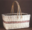 A beautiful wicker basket with a double pairing arrow in the middle and a handle wrapped with cane. Dimensions: Base - 8" x 12", Top - 11 1/2" x 14", Height - 6 1/2", Height with handle - 13". Author: Flo Hoppe