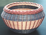 "Through my intense study of Japanese basketry I have discovered many unusual and interesting techinques and ridge weave is one that l've been experimenting with for a while. In this Ridge Weave Basket, the closely spaced spokes are woven with chasing weave - one set of firmer weavers establishing the ridges, the other more flexible weaver keeping the ridges in place. The two sets of spokes are incorporated into the top band of 3-rod wale, then woven into an unusual double rolled border." -- Flo Hoppe.