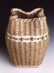 Combine flat reed spokes with seagrass and flat reed weavers to create this gracefully shaped texturally appealing basket. Size: 5" x 12". Author Dianne Stanton offers you a unique and easy basket.