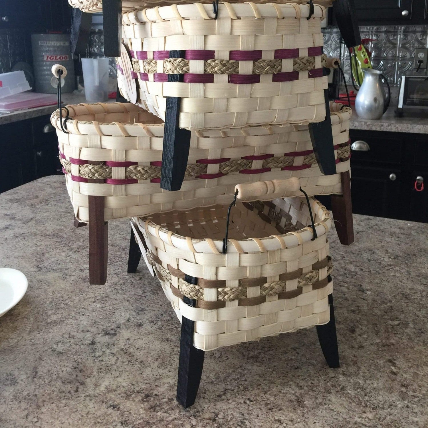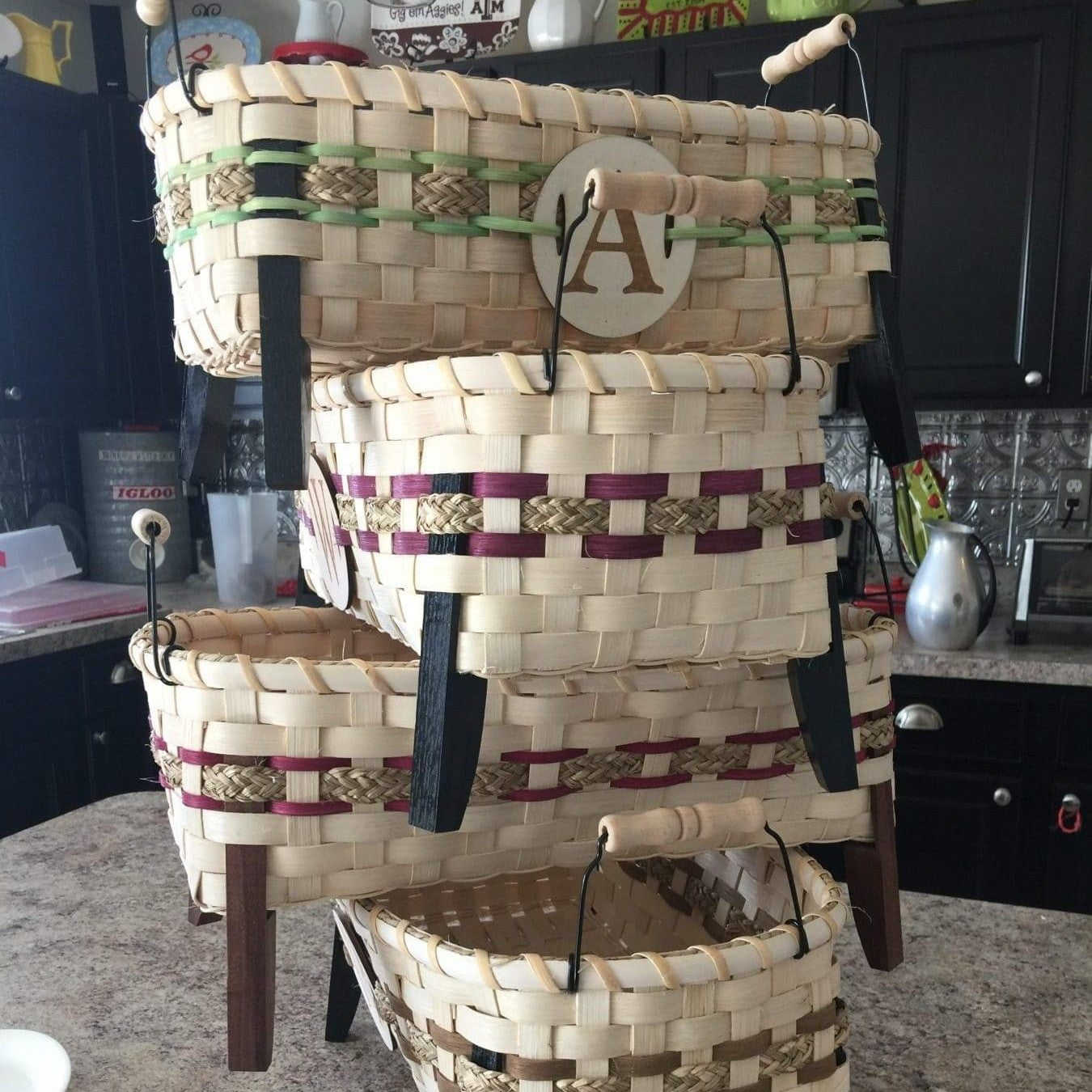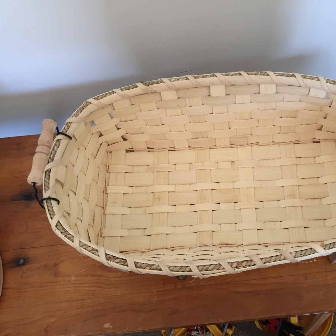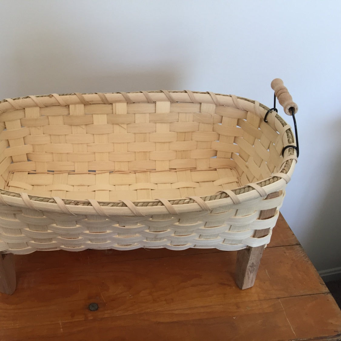 The Table Runner basket is so far my all time favorite basket. It's so functional and we use it to hold our everything things in the kitchen. With it's wooden legs and wire/wooden handles it has a striking personality. The table Runner Basket is 6"x14" and features a woven bottom. A wooden disk is an additional $5.00.