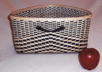 Another unique pattern from Annetta Kraayeveld! Build this basket from a triangular slotted base with dyed stakes (both flat and flat oval reed) and your choice of cane or flat oval weavers. Rim is lashed with 4-ply waxed linen and the basket's handle is a standard 'pull' handle that can be found at any hardware store. Note the neat twill design. Finished size: 13 x 9 inches; 7 inches high. Advanced Weaving Level.