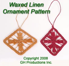 Lovely needle-weave waxed linen ornament pattern--make these for your holiday tree, for hanging in a window or trimming a present. Step-by-step photo instructions call for 2" square, 2" diamond (measuring 3" in diameter) or 2.25" diameter round wire shapes. (Each ornament uses 8 yards of 4-ply waxed linen.) Pattern by Beth Hester, Basket Maker's Supply. Pattern is free for you to print from our website--copy the patterns and share with your friends.