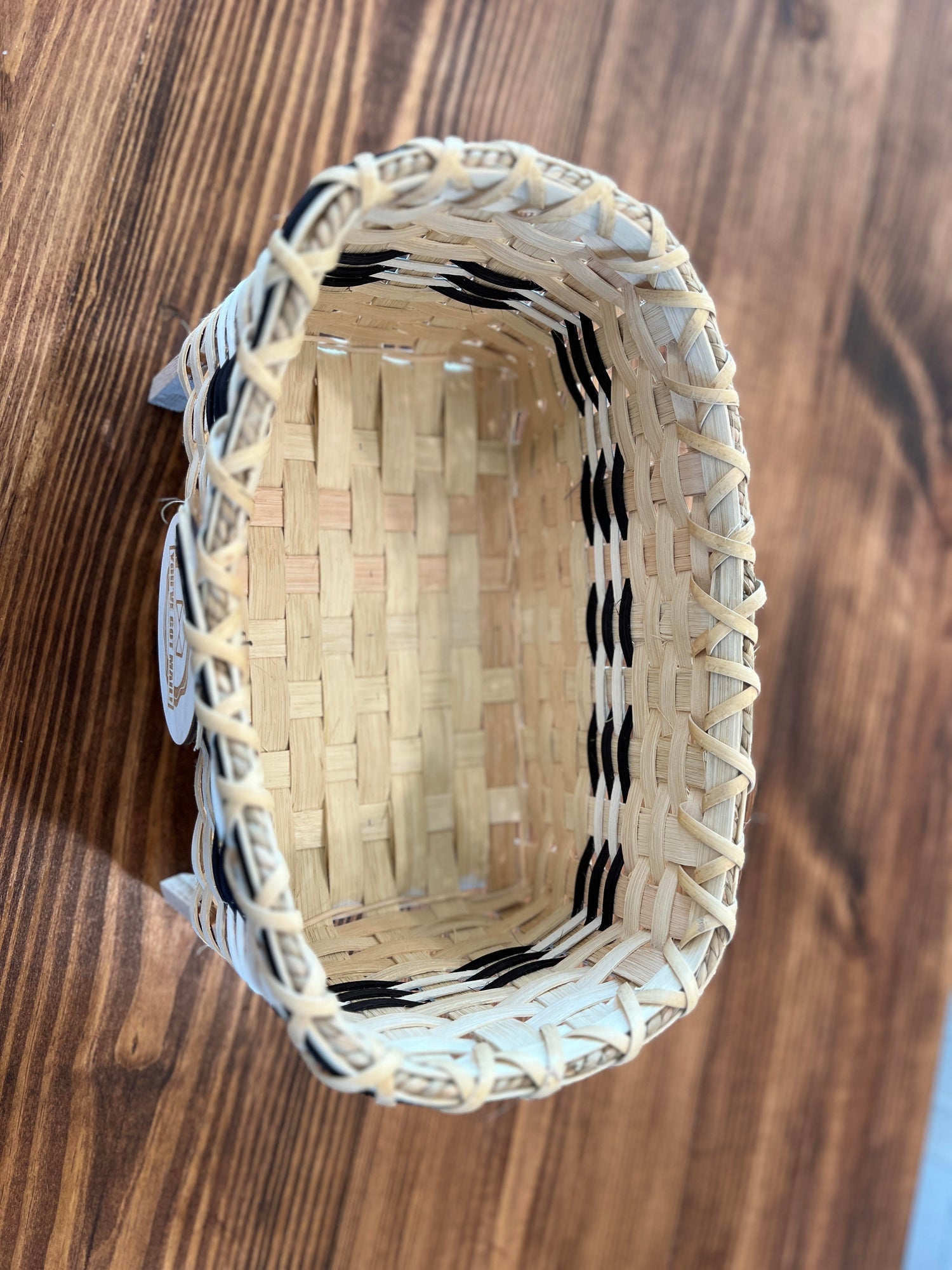 Finished Basket Dimensions: The woven part of the basket, not including feet stands 6” tall. With feet it is 8” tall and has a 33.5” circumference.