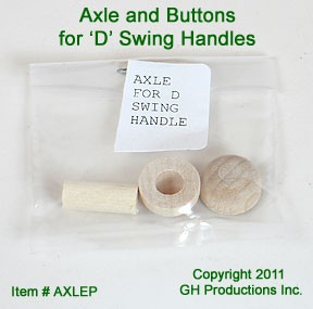 Need to repair a broken axle on your pegged swing handle? We've got the replacement parts -- birch axle (5/8 inch long x 1/4 inch diameter) and 2 buttons (1/2 inch diameter). Simply assemble parts through your handle and glue, securing buttons to the ends of the axle.