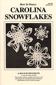 Great weaving instructions with 23 photos take you step-by-step through making Carolina snowflakes! Billie Ruth Sudduth guides you with her expertise--all you need is some 1/4" flat reed, a little waxed linen, and a bit of glue --you'll have the other tools (clothespins, scissors, tape measure and awl) in your tool kit. Great fun--a perfect gift or ornament. Pattern includes instructions for 7", 10" and 13" diameter Snowflakes.