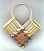 How fascinating! Here's the story of Dianne Stanton's development of the Choctaw Elbow Pattern....."In 1988, I traded baskets with a dear friend and fellow basketmaker, Claude Medford, Jr. The basket he made for me was a double mouth elbow basket of dyed and natural river cane, that he gathered and prepared near his home in Natchitoches, Louisiana. In the letter with his basket, Claude wrote, You can dry herbs in elbow baskets, or put the handles first of wooden spoons in both sides. They are usually hung in the cook houses, which in the ol 'South were separate from the living quarters. This basket is similar in technique to the one Claude made for me, but is made of dyed flat and flat oval reed. It has a 3/3 twill woven base with point twill turn, spiral woven sides, splint-style rims and a wrapped handle." Basket measures 13" wide, 16" high (including handle) and 4" deep.
